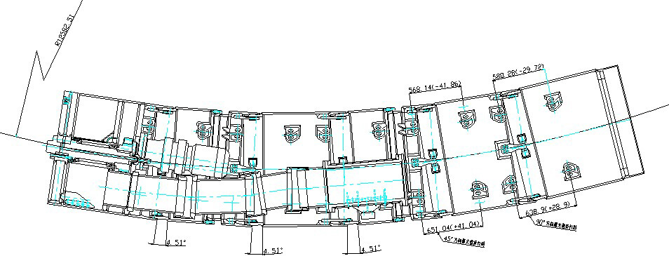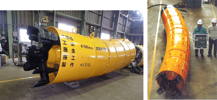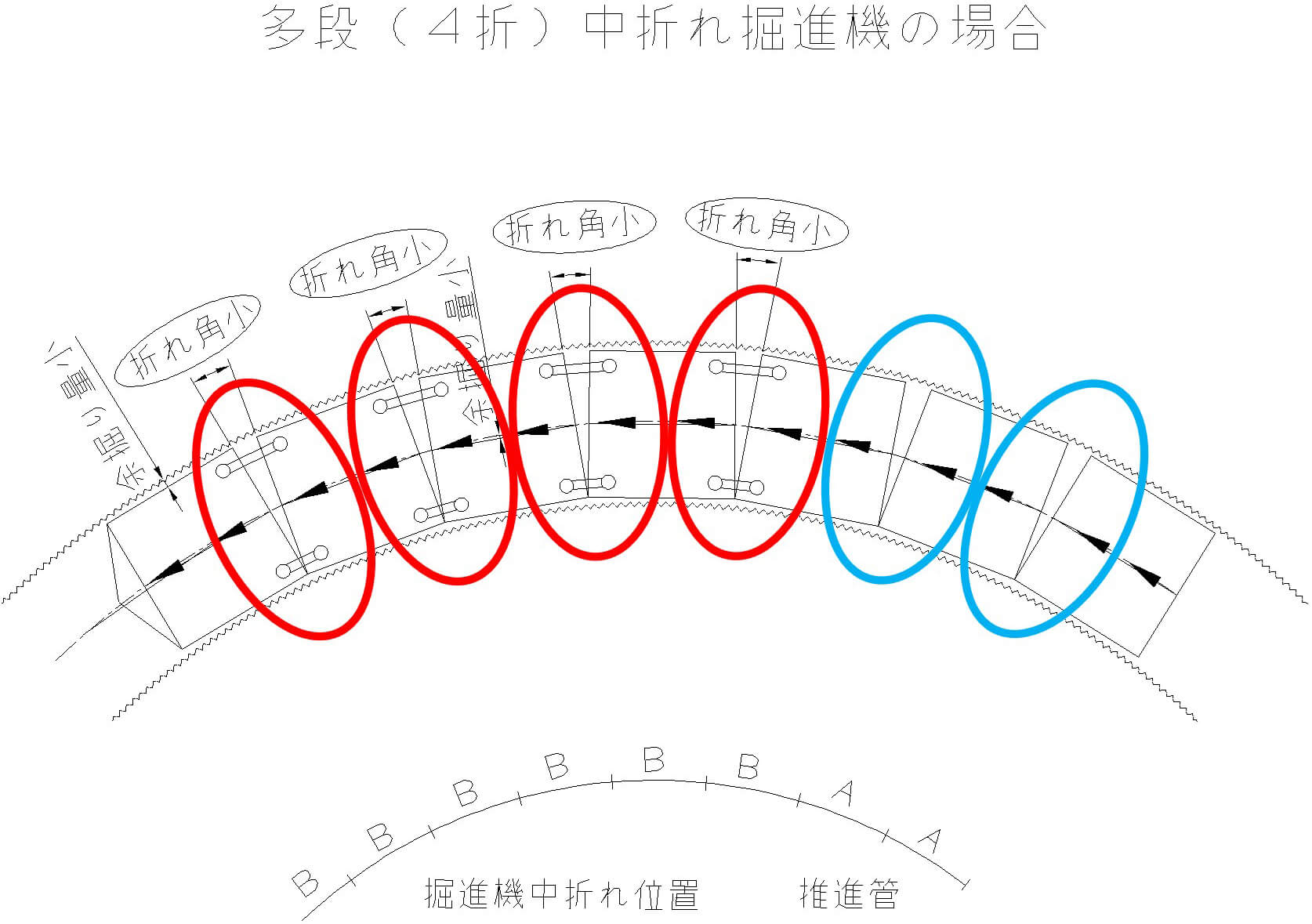 標準的な急曲線掘進機の場合、1~2段の中折れとなっていますが、その場合、折れ角が大きくなり、