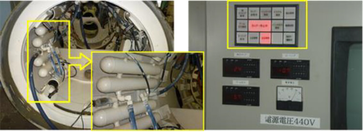 掘進機内の予備タンク設置状況および遠隔操作盤における警告ランプ点灯状況写真(参考)