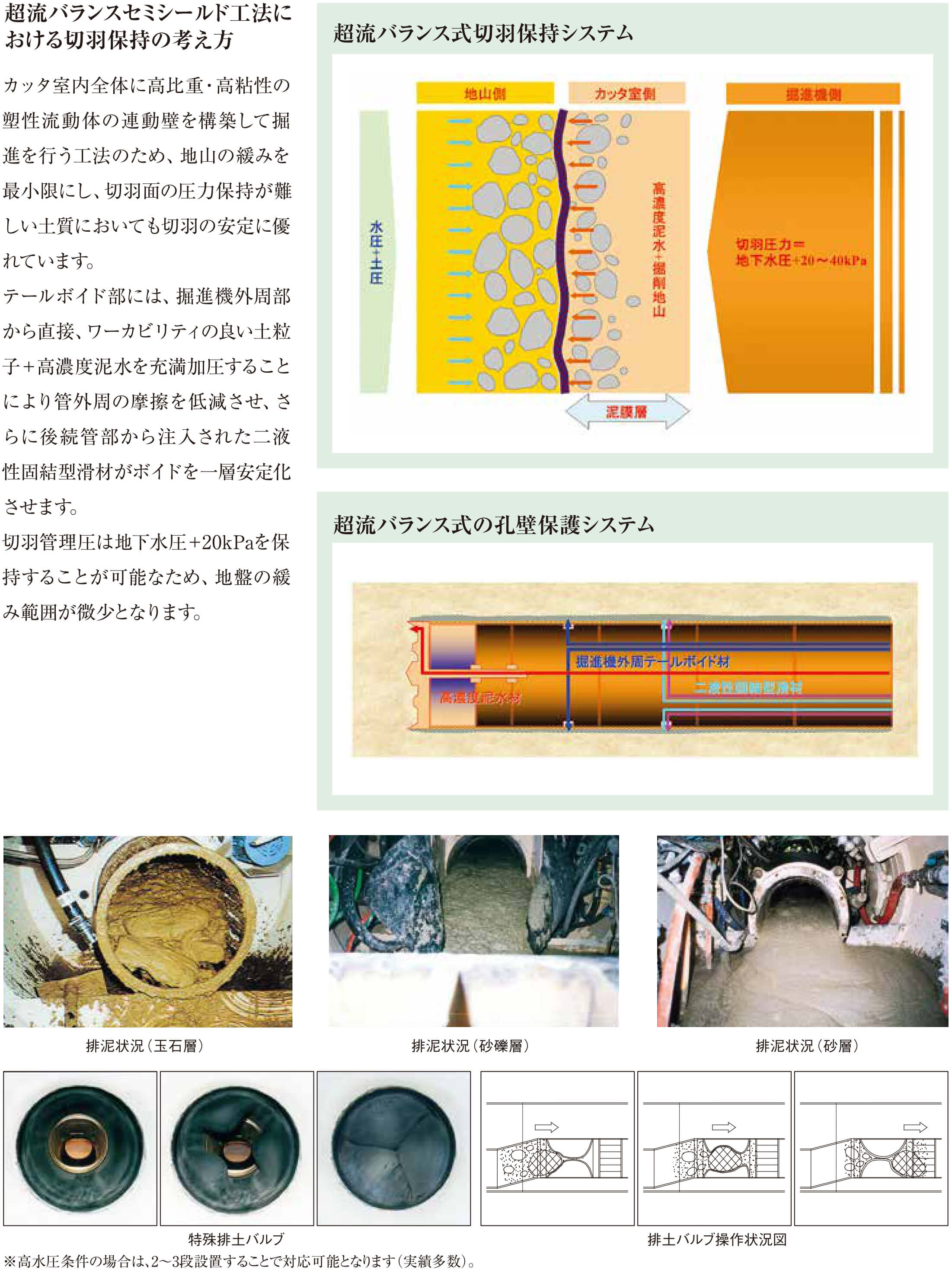 本工法は、そのような不安定要素を解消するために、カッタ室内全体を塑性流動体と液性流動体の中間的な性状(泥土性状)により、