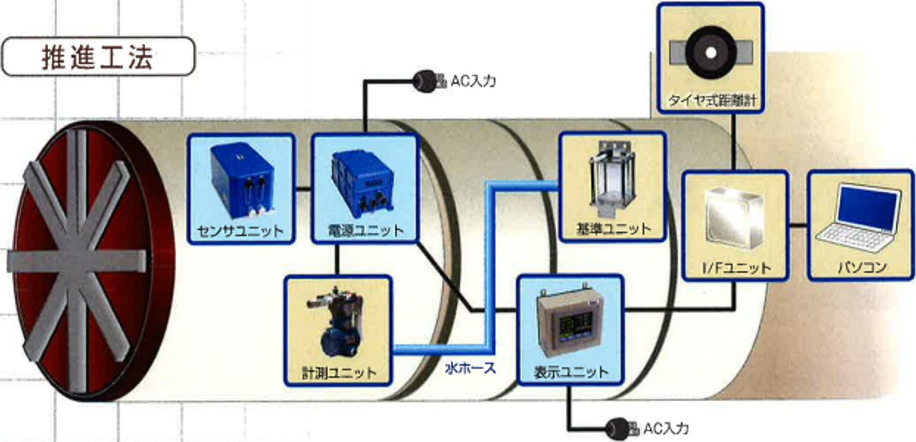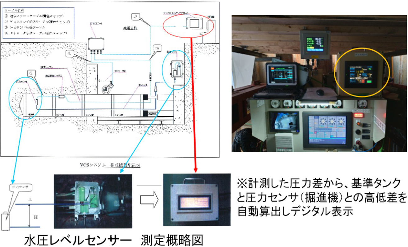 掘進機にセンサを設置して水ホースを立坑間とつなぎ、立坑内に設置した水タンクの水位を一定に保持することで、 立坑内の基準水位とセンサ位置との高低差を計測される水圧により換算し、リアルタイムで掘進機高さを計測、表示するシステム。