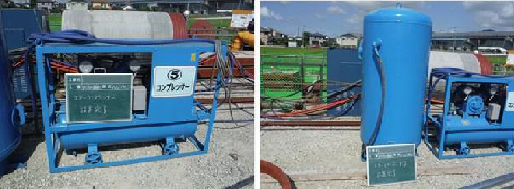 エアコンプレッサは、泥濃式推進工法における排土バルブの開閉作業を行うための重要な設備であります。 異常時においてエア圧が低下した場合には、遠隔操作盤に緊急ランプが点灯するとともに、 コンプレッサ隣には大型(容量1㎥)のエアタンクを設置することを標準とし、安全に配慮した機構および設備となっております。